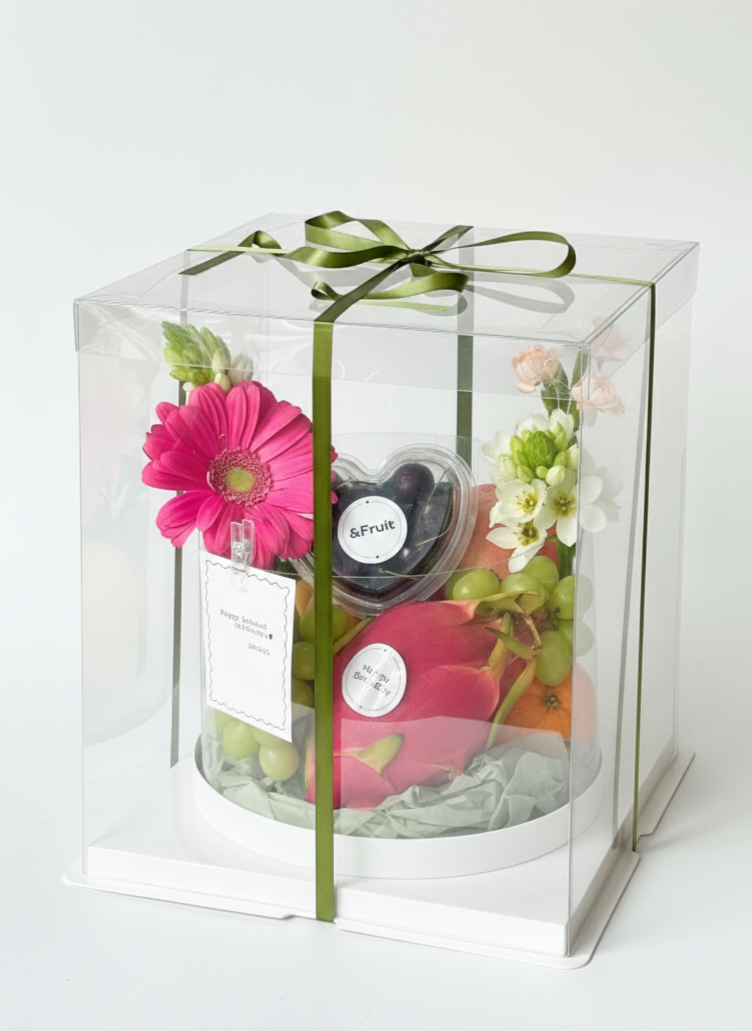 Our signature fruit cake features 7 - 8 premium seasonal fruits, topped with delicate florals in a clear acrylic box. Add a custom message for birthdays, celebrations, or just because.
