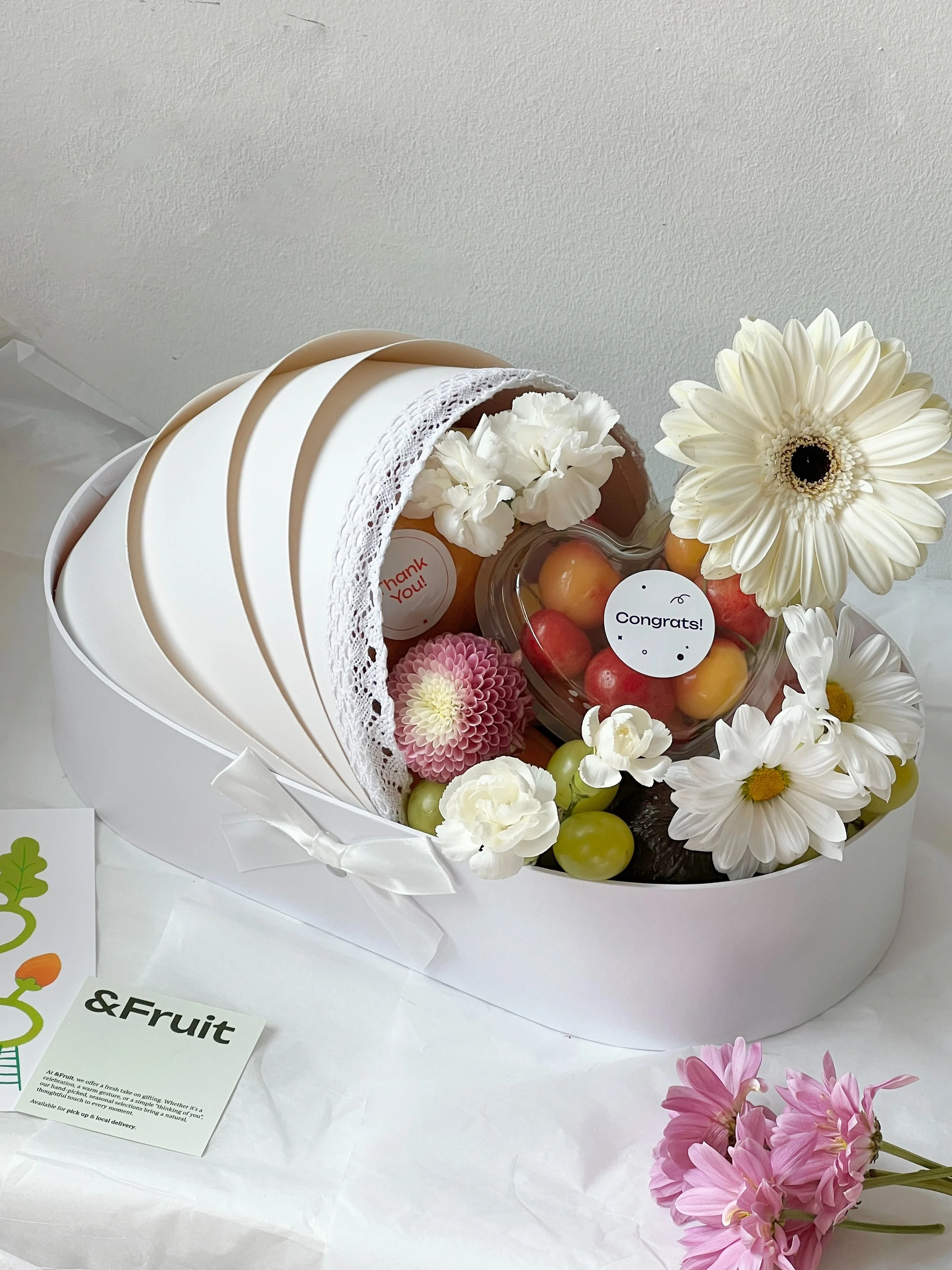 A sweet gift to celebrate new beginnings. Featuring 6–8 fresh seasonal fruits in a cradle-shaped box, accented with soft florals and a custom message—perfect for welcoming a baby or congratulating growing families with beauty and care.