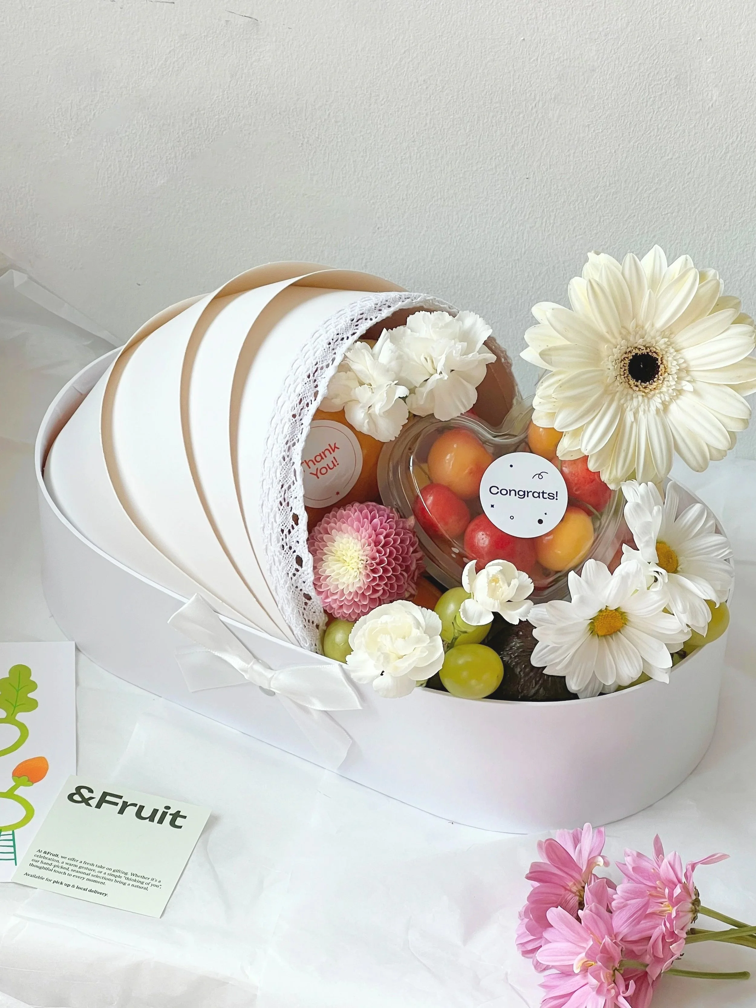 A sweet gift to celebrate new beginnings. Featuring 7– 8 fresh seasonal fruits in a cradle-shaped box, accented with soft florals and a custom message—perfect for welcoming a baby or congratulating growing families with beauty and care.