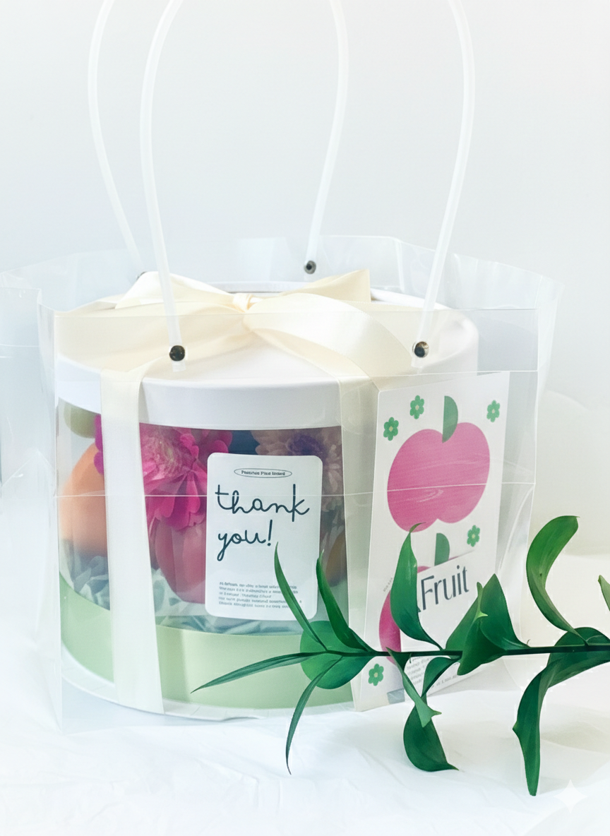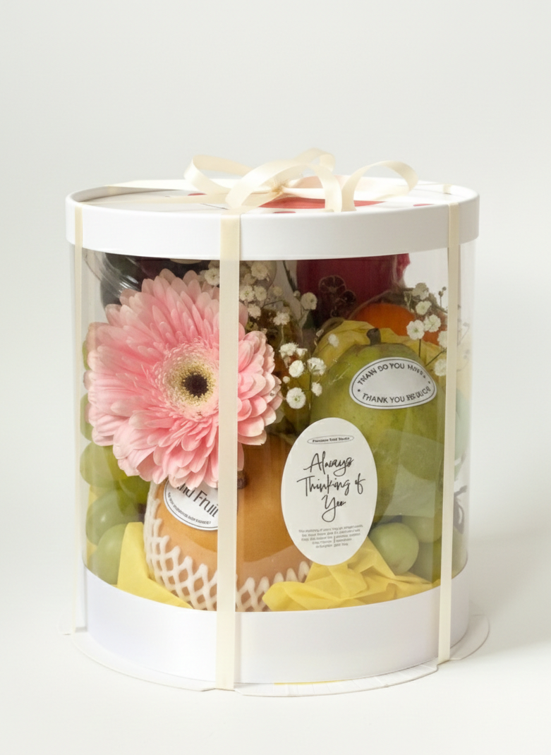 A refined round box with 8–10 fresh seasonal fruits curated for beauty and flavor. Great for gatherings, special occasions, or a generous, thoughtful gift. The size is pretty big enough to hold 8 - 10 fruits.