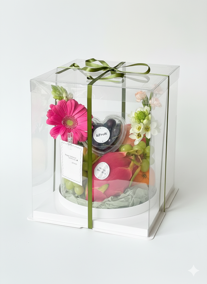 Our signature fruit cake features a beautifully arranged selection of 6–8 premium seasonal fruits,